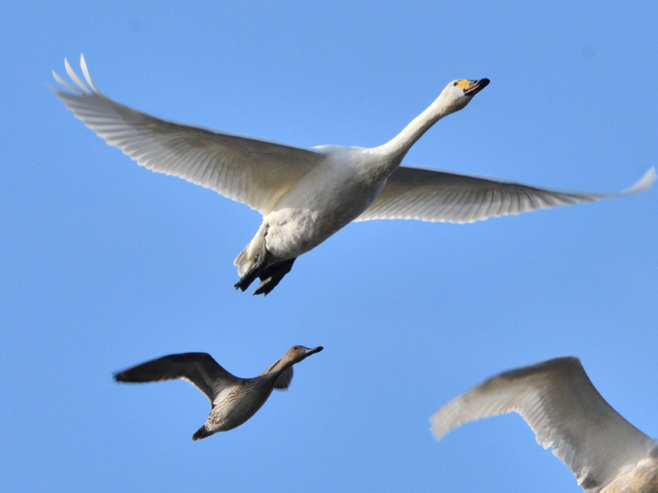 11月7日、コハクチョウの家族の中にオナガガモが1羽混じって飛んでいました。自分のことをコハクチョウと思っているのでしょうか?