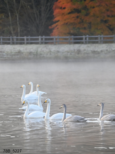 11月14日の飛来数は235羽。朝は今季一番の冷え込みで芝生は真っ白に。早朝、堤には毛嵐が発生し幻想的な雰囲気になりました