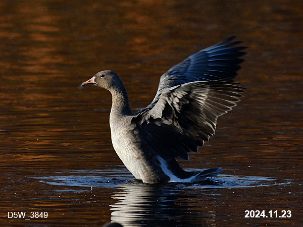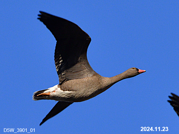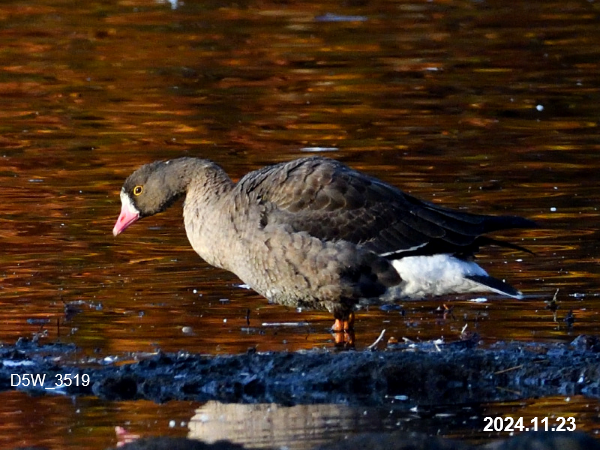 11月23日、間木堤でマガンに混じってカリガネ1羽を確認しました。11月上旬から時々マガンの群れが立ち寄っていましたが、この日ようやく近くに寄って来て、カリガネが混じっていることが確認できました。