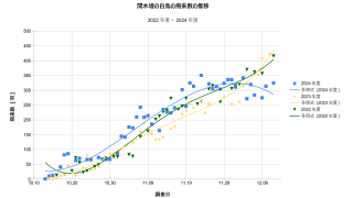 12月中旬までは、昨年・一昨年と比較して少なめでしたが、昨年並みに回復してきました。この時期の数十羽レベルの変動は例年通りなのかもしれません。ここ数日、堤の水面も氷っているせいか、白鳥もあまり動きません。 最新の飛来数はこちら