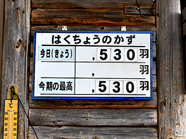 ハクチョウの飛来数、今期最高値を530羽に更新しました。昨年の2月4日は561羽、2月5日は623羽でしたので昨年より少ないです。今朝は風が少し強かったのですが気温が上がったせいか、朝8時30頃までには殆ど飛び立って行きました。