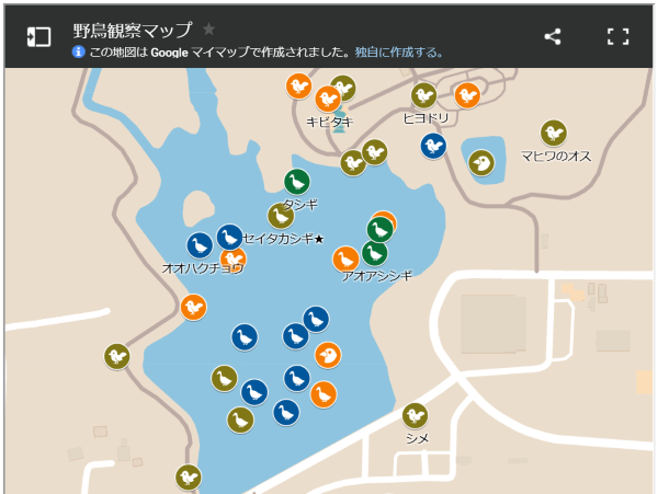 おいらせ町周辺で観察した野鳥の種類と位置を示しています。
