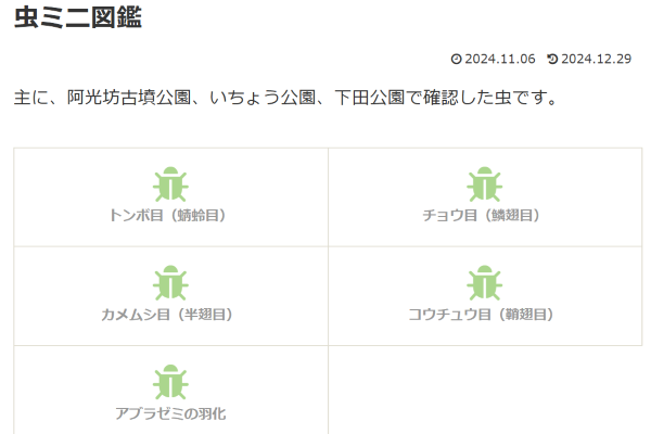 虫ミニ図鑑 2024.11.062024.12.29 主に、阿光坊古墳公園、いちょう公園、下田公園で確認した虫です。 トンボ目(蜻蛉目)チョウ目(鱗翅目)カメムシ目(半翅目)コウチュウ目(鞘翅目)アブラゼミの羽化