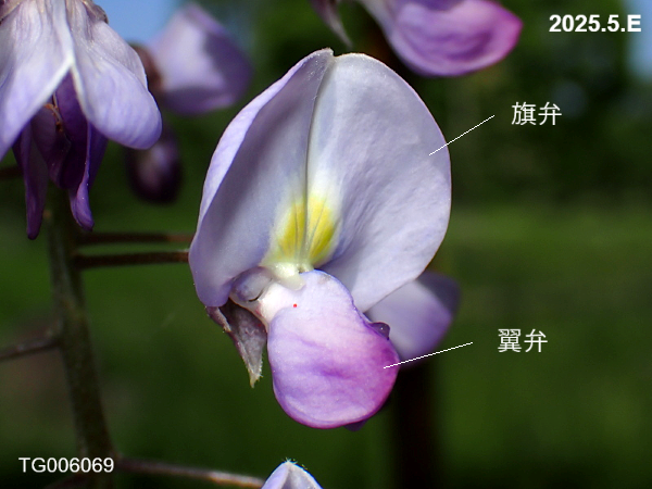 藤の花は蝶形花と呼ばれ、旗弁(1枚)、翼弁(2枚)、竜骨弁(2枚)の5枚の花弁で構成されます。