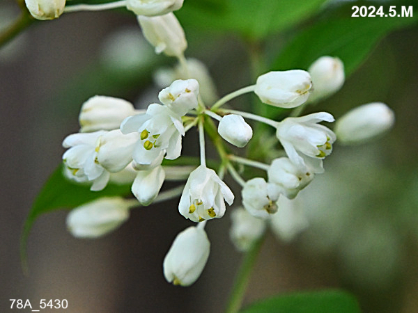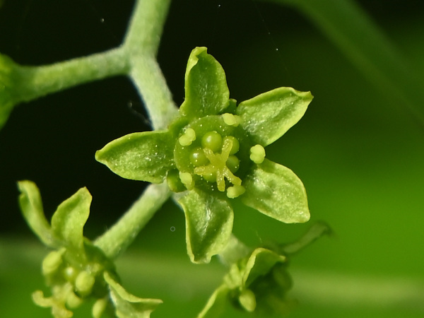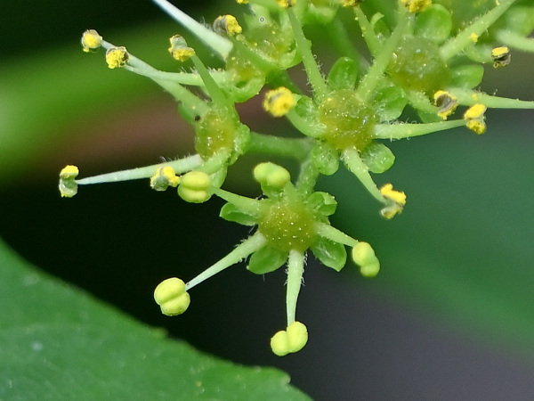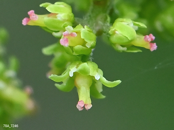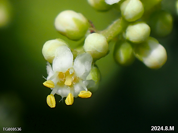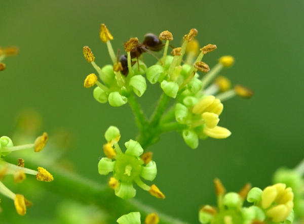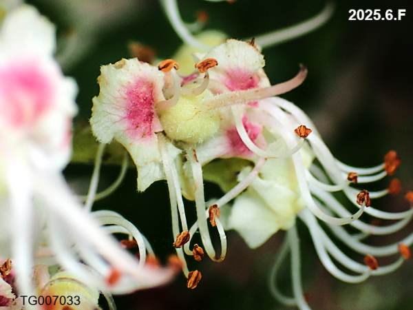 円錐花序は大部分が雄花で、わずかに両性花も付きます。花の色は開花後は白くやがて赤くなります。花粉を運んでくれるマルハナバチに、花を赤くして密が無いことを教えているのだとか。