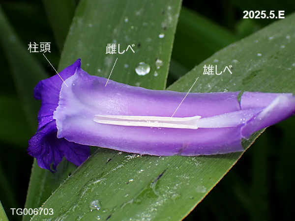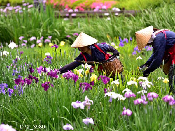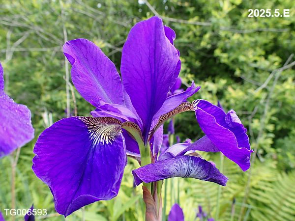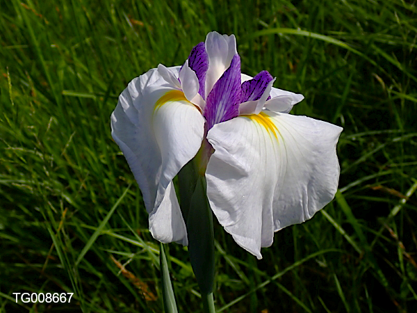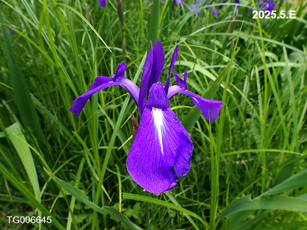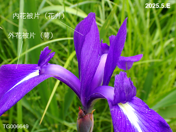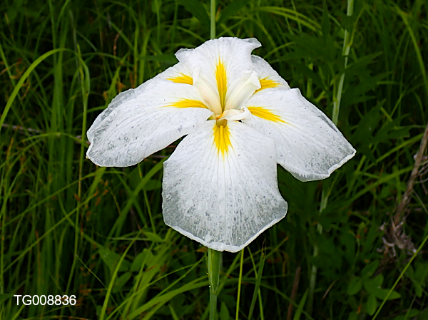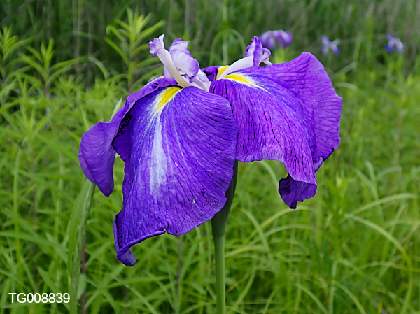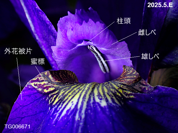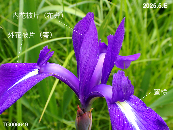 アヤメ、カキツバタ、ハナショウブは外側の花びら状(外花被片)の部分の蜜標で大体識別できます。アヤメの蜜標は網目状、カキツバタは白い斑紋、ハナショウブは黄色い斑紋です。