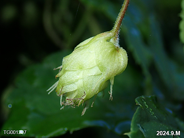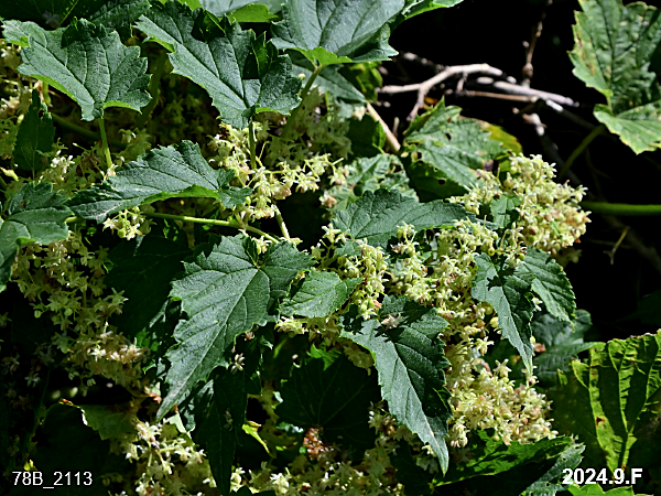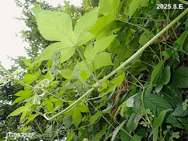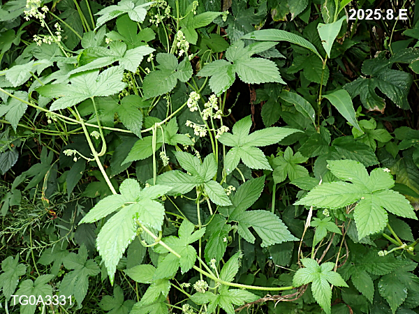 雌雄異株。葉は5 – 7裂に深く切れ込んだ掌状。小さな棘が無数に有り指や服にくっつきます。