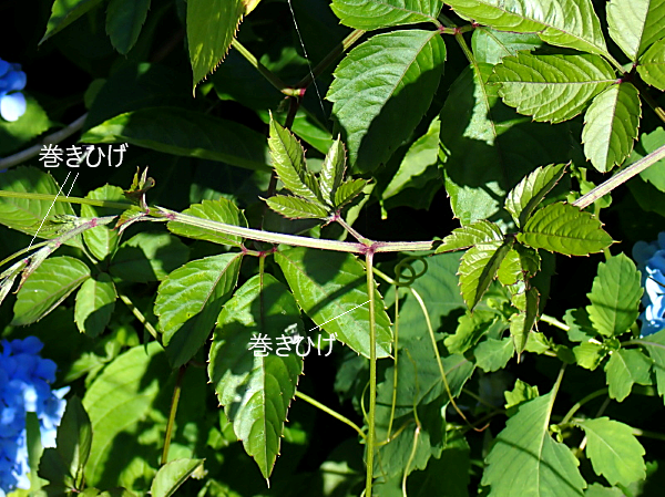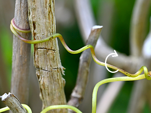 巻きひげの先端で巻き付いた後、巻きひげの中央が捻じれて茎を引き寄せます。(棒の両端に長めの紐の端をそれぞれ固定し、紐の中央を持って棒に巻き付けるイメージです。)この一連の動作がどのような仕組みで行われているのか興味深いです。