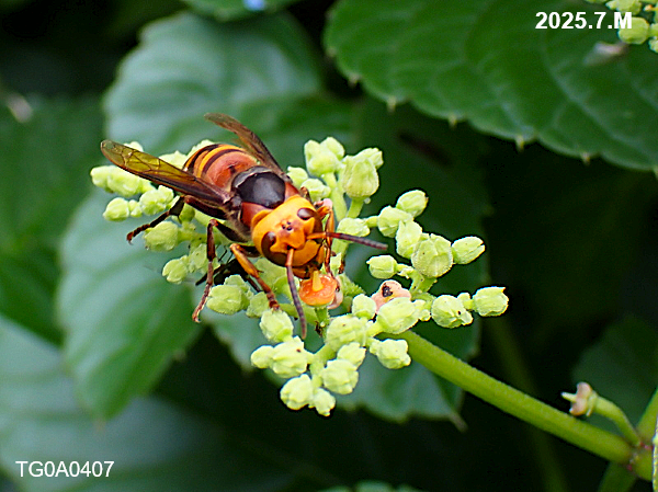 ヤブガラシは蜜が豊富でアリやコガネムシがよくやって来ますが、スズメバチまでやって来たのには驚きました。(一口舐めただけで飛び去って行きましたが)
