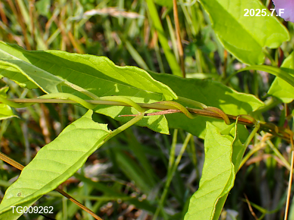 ヒルガオ 2025.07.10 ヒルガオ ヒルガオ科のつる性の多年草。つるはZ巻きです。花はハマヒルガオと似ていますが、葉の形は細長い三角形で、ハマヒルガオは丸形です。 つると葉 ハマヒルガオの葉 ピンク色、赤紫色の花ヘ [野草]