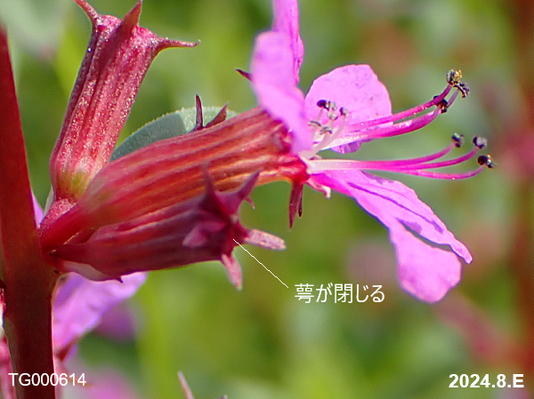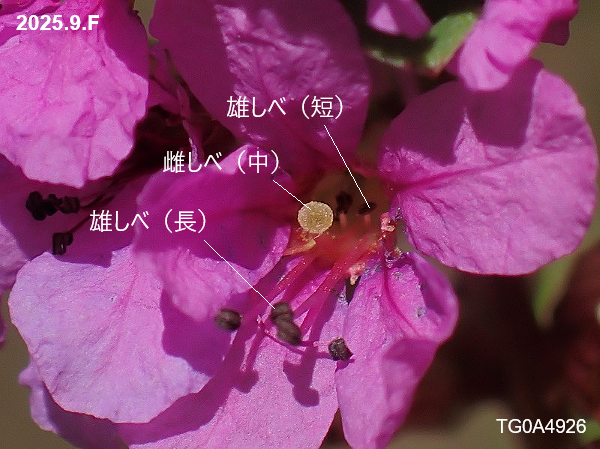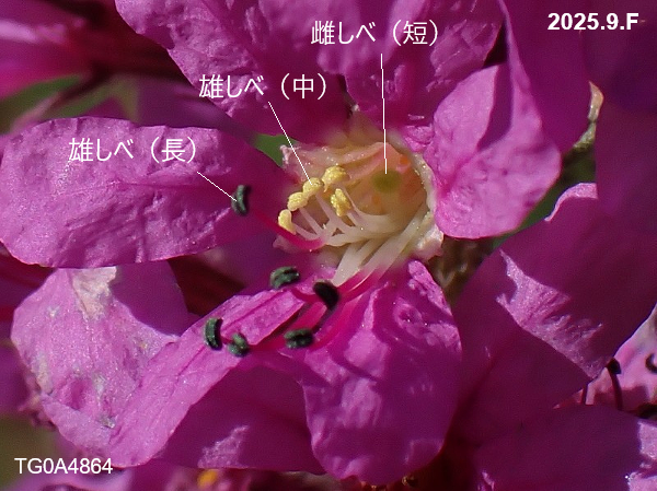 ミソハギの花は三型花柱性(異花柱性)で、雌しべの長さが「長」、「中」、「短」の3タイプがあります(株による)。それに応じて雄しべの長さも「中+短」、「長+短」、「長+中」の組み合わせになっています。(雄しべは9個有ります。)