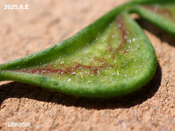 果実はメガネの様な形。表面には肉眼で見えない小さな突起が有り服にひっつきます(「ひっつき虫」)。(下の写真では白い毛の様なものです。)
