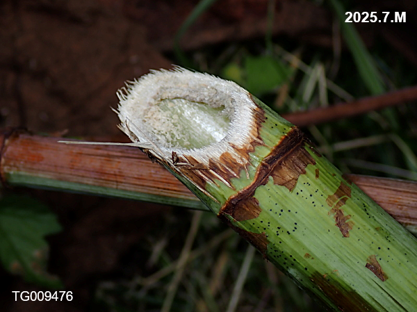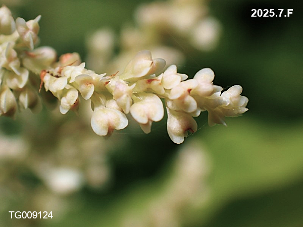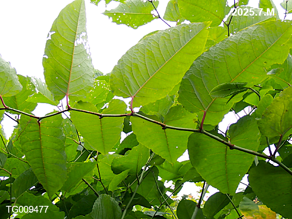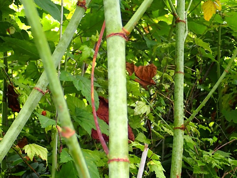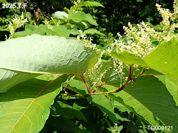 オオイタドリ 2025.07.102025.07.11 オオイタドリ(大虎杖、大痛取) タデ科の多年草。雌雄異株。2m位にもなる大型の野草です。大痛取の名前の由来は、若葉を揉んで貼ると痛みが和らぐという民間療法で用いられたからだとか。雌花には3枚の翼があり、葉の裏は白っぽいです。 葉の裏は白い 雌花 若い果実 茎に節あり 茎は中空 白色の花へ [野草]