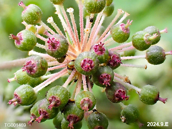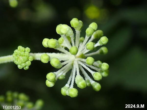 タラノキ属 2025.08.18 ウド(独活) ウコギ科タラノキ属の大型の多年草。両性花序の下に雄性花序がつきます。写真(蕾2)の左側が雄性花序です。 9月 2回羽状複葉 蕾1 蕾2 両性花 両性花 雌性期 白色の花へ [野草]