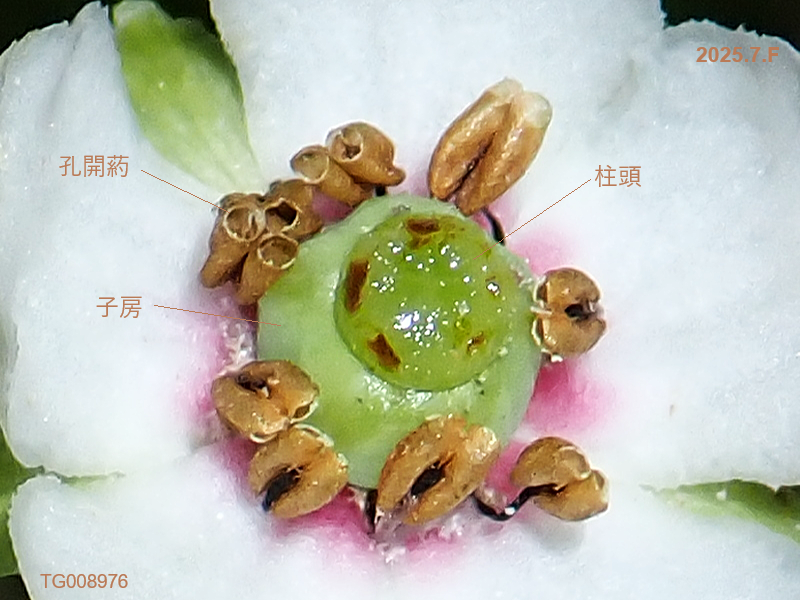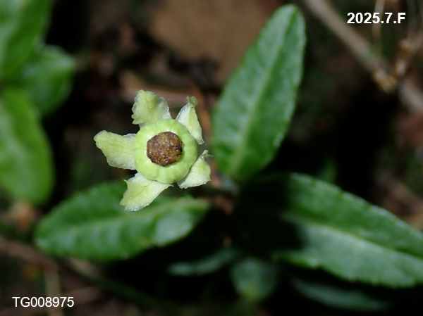 ツツジ科ウメガサソウ属の常緑の草状の小低木。樹高15cmくらいで「草」にしか見えませんが、「木」に分類されるそうです。花の中央の緑の部分は雌しべの柱頭で、その下は子房です。葯は孔開葯で、葯の先端に穴が開いてそこから花粉を放出します。