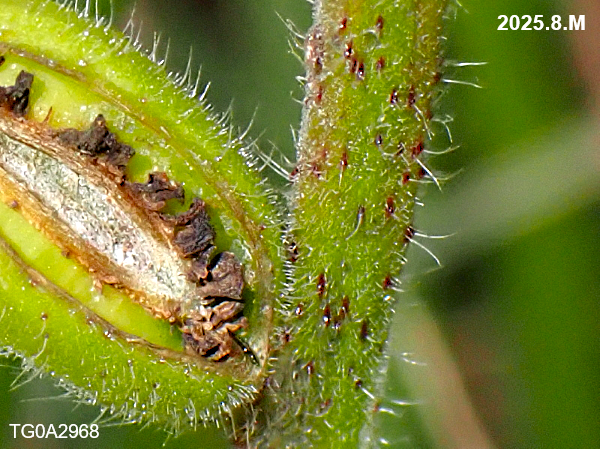 オオマツヨイグサの茎の毛の基部には暗赤色の突起があります。