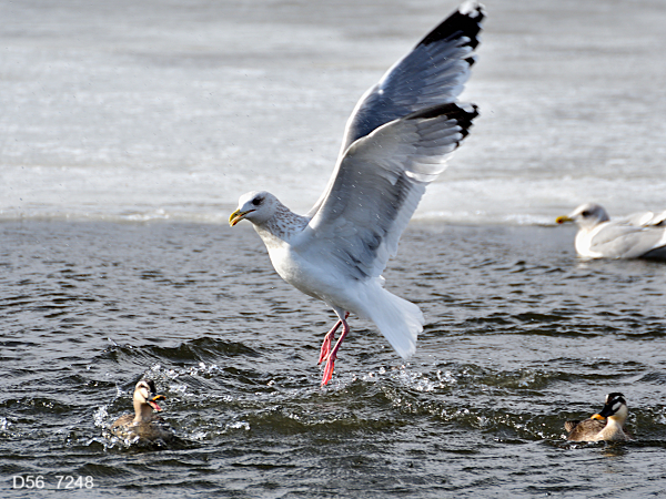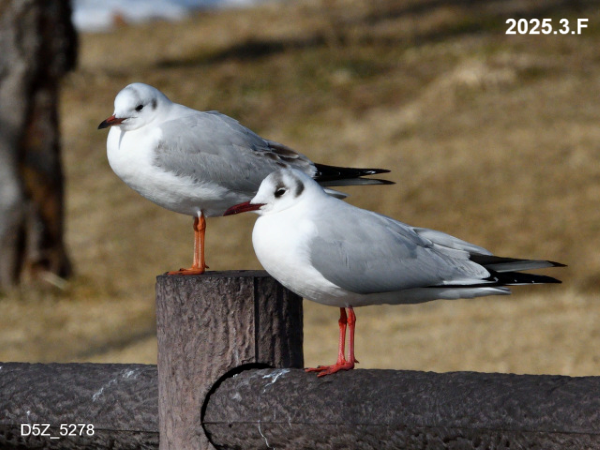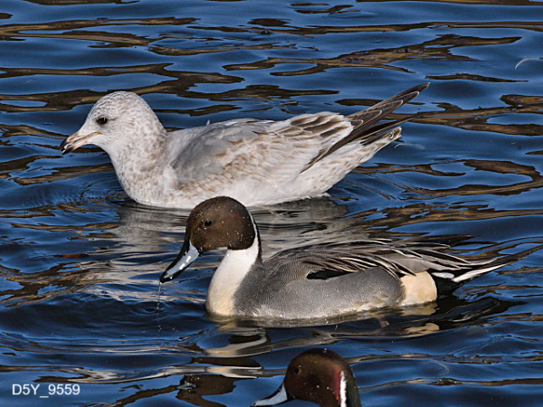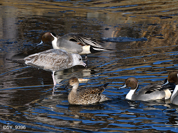 図鑑などで調べるとカモメの全長は44~52cm、オナガガモのオスは68cm前後(尾羽も含んだ長さなので大きい)、メスは54cm前後となっています。写真ではオナガガモと同等か若干大きく見えます。