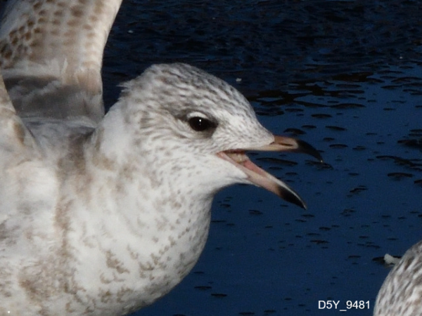 尾羽に黒い斑紋が残る、雨覆の一部が茶色、足や嘴がややオレンジ色などから第2回冬羽と思います。
