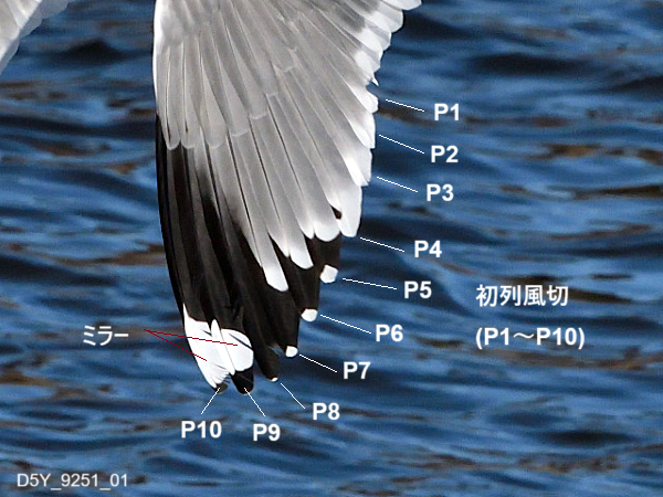 10枚の羽で構成されており、内側からP1~P10と呼ばれます。止まっているときはそれぞれの羽が重なるため、長さの短いP10はP9の下に隠れて見えません。