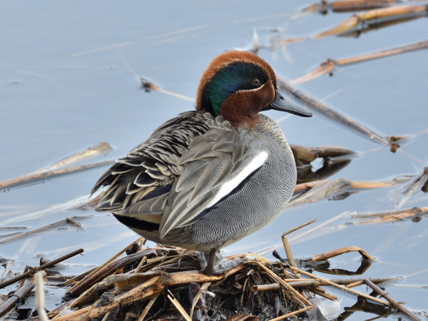 カモ目カモ科マガモ属の冬鳥。マガモより小さいです。