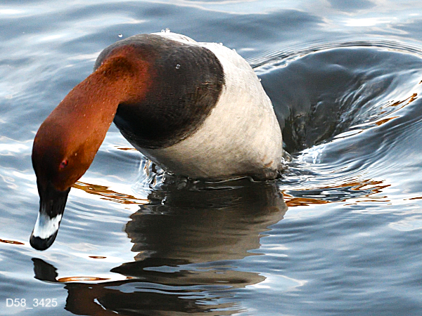 水中の食べ物を探すときは、勢いをつけてダイブします。水に潜って採食するので、潜水採食性カモ類と分類されます。