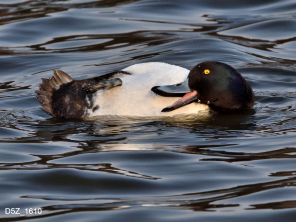 水上に居る時間が長いキンクロハジロは、水の上で白いお腹を見せて羽繕いします。
