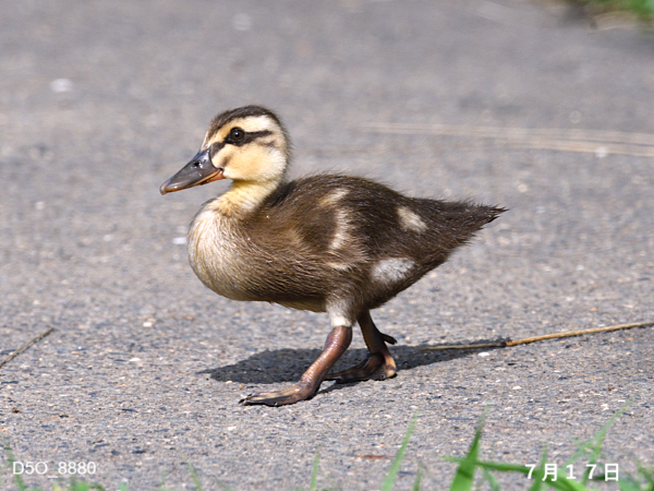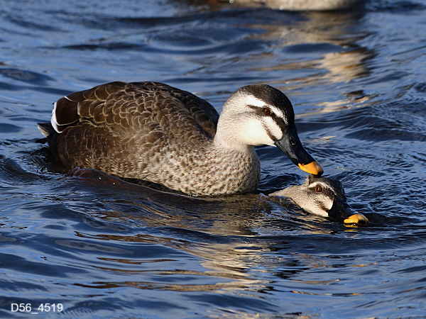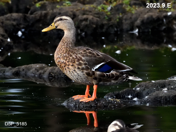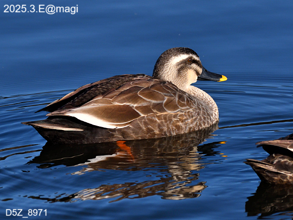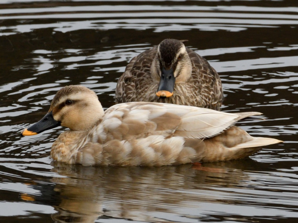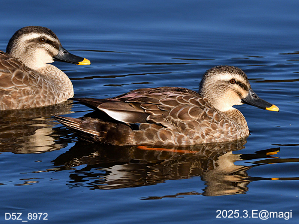 写真①は、胸の色が茶色です。写真②は、嘴全体が黄色いです。マガモのオスの幼鳥かもしれません。間違い探しのよう。