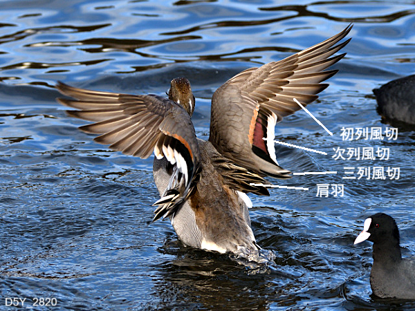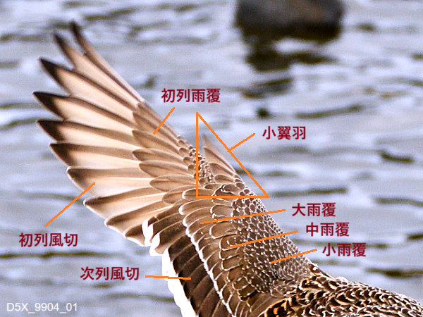 - 雨覆:風切羽の保護、翼面をなめらかにする