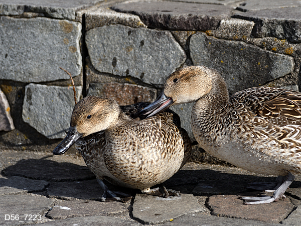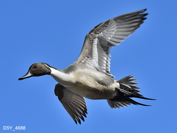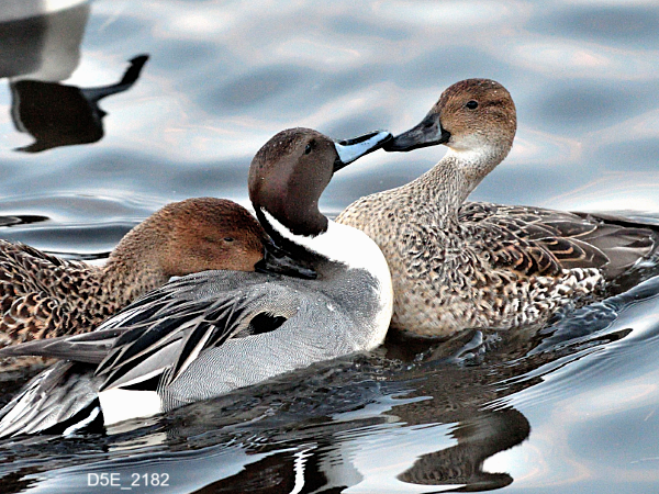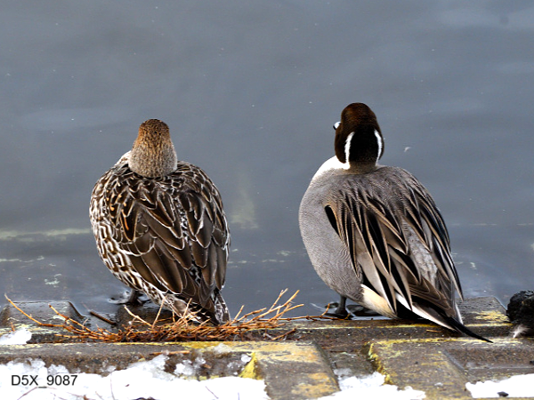 冬、間木堤にやって来る代表的なカモです。オスは尾羽が長く、次列風切の翼鏡は濃い緑色(角度によっては明るい茶色に見えることも)です。オレンジ色に見える部分は大雨覆の先端です。肩羽は笹の葉のように細長く、色は内側が黒く縁が白色です。
