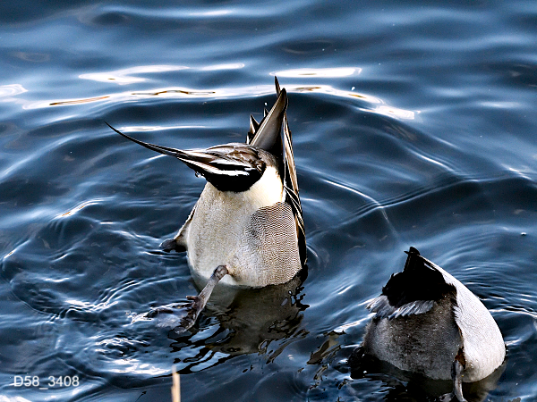 オナガガモは水中に潜って採食しないので、水面採食性カモ類と呼ばれます。