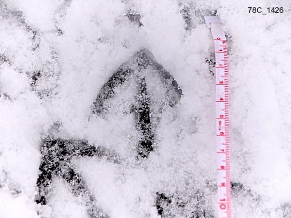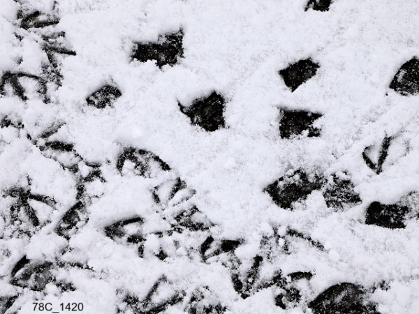 足跡の大きさは7cmくらいで、蹼(みずかき)の跡は深く残りません。写真②はオナガガモとカモメの足跡です。カモメの足跡(右上)は蹼(みずかき)も深く残り、菱型の形の足跡になっています。