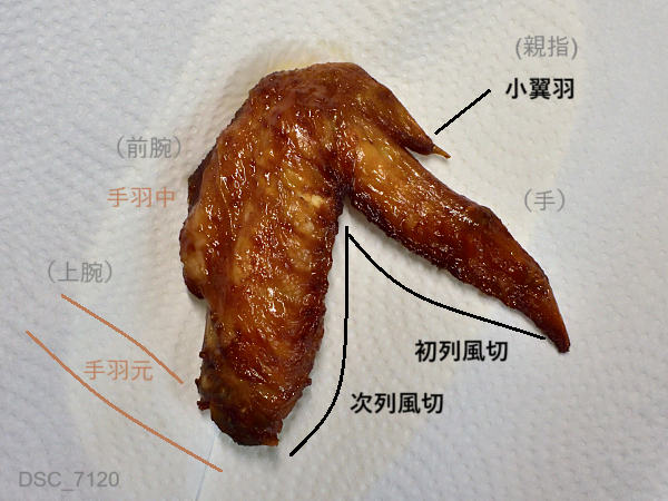 鶏肉の「手羽先」は人の「前腕」と「手」に相当する部分で、それぞれの部分に次列風切、初列風切、小翼羽が付きます。
