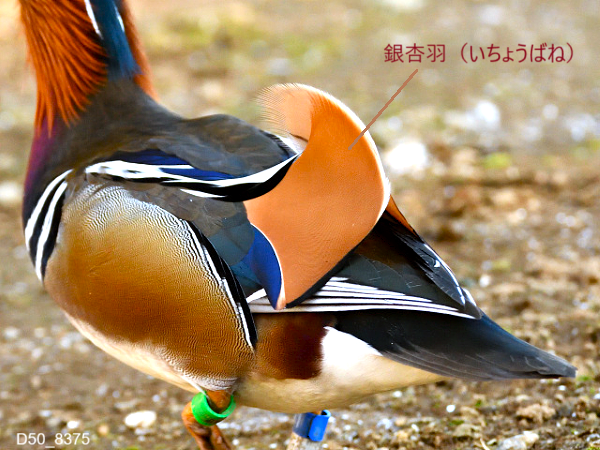ドングリが実るころ、下田公園、いちょう公園にも一時やって来ます。オスのカラフルな羽の色が特徴的ですが、風切羽の一部(三列風切)が上を向いているのも独特です。この羽の形がイチョウの葉の形をしていることから銀杏羽(いちょうばね)と呼ばれます。メスにアピールするためらしいです。