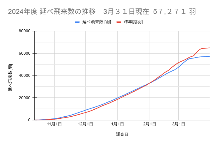 間木堤の白鳥飛来数の推移 2021.07.032026.01.29 2024年度の飛来数 白鳥の飛来数は、白鳥保護監視所に掲載されている「はくちょうのかず」です(朝7時頃確認)。延べ飛来数の計算あたっては、欠損した日付のデーターは前後の飛来数の平均値で補間しています。平均気温は、気象庁のHPの過去の気象データーより三沢市の気温を参照しています(おいらせ町のデーターは無いため)。 前へ次へ 12345
